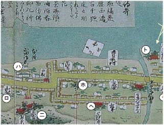 ホ 御高札(おんこうさつ) 東材木町の北側の建物の中にある。 「廿日市上下駕籠定の事 玖波江四里本馬百八十文半馬百五十二文軽尻百廿四文人足六十文広島江三里本馬百廿四文 半馬百四文軽尻七十九文人足六十文」と書かかれており、廿日市が宿場町であることがわかる。 波打ち際が今の宮島街道辺りか? |